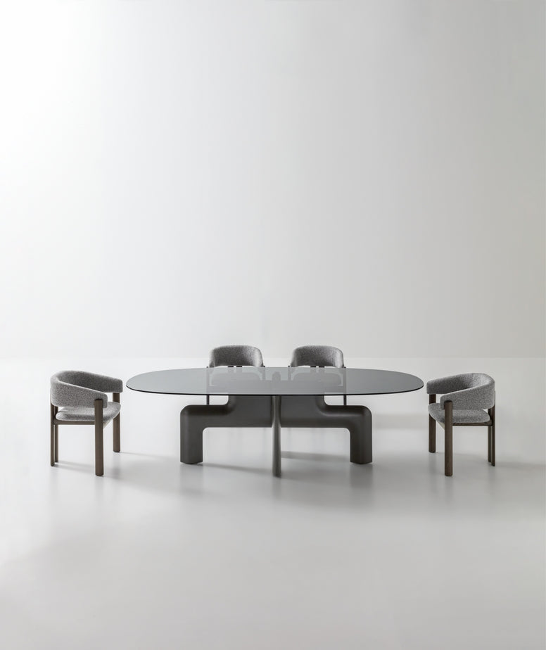 Bordet leger med kontrasterne mellem den tekniske, formstøbte base og den organiske bordplade. Uanset om du vælger toppen i varmt træ, eksklusivt marmor eller mystisk røget glas, får du et møbel, der definerer rummet. Biarritz er ikke for de tilbageholdende; det er for dig, der vil gøre spisepladsen til en oplevelse.