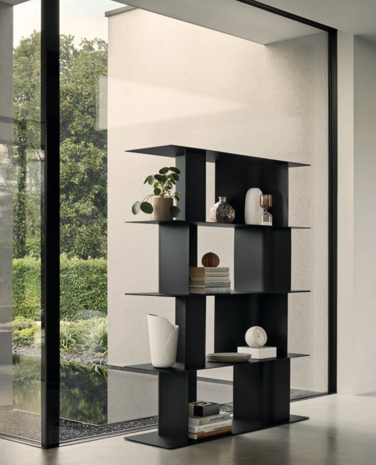 Carv er et modulært reolsystem med en skarp, moderne æstetik. Reolen består af tynde stålplader, der udgør hylder og sider, hvilket giver et let og minimalistisk udtryk. Samtidig er hyldernes understøtninger diskret integreret, så hver sektion synes at svæve i rummet. Carv er utroligt fleksibel: modulerne kan placeres side om side horisontalt eller stables vertikalt, alt efter det ønskede design og opbevaringsbehov. Systemet kan endda fungere fritstående som en rumdeler i midten af rummet, da det fremstår lige flot fra alle vinkler. Trods sit slanke look er Carv meget stabil og kan bære en betydelig vægt, hvilket gør den ideel til alt fra bøger og pyntegenstande til multimediaprylar. Det visuelle udtryk er stringent og arkitektonisk – en hyldest til less is more.