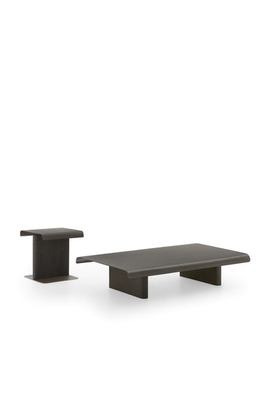 Bordpladen i formspændt træ har en let opadbøjet kant, der minder om en bakke eller et blad, hvilket giver designet en raffineret detalje og forhindrer ting i at trille af. Den asymmetriske form gør det nemt at bevæge sig rundt om bordet og skaber et naturligt flow i stuen. Kombiner det store sofabord med det mindre, højere sidebord for et dynamisk udtryk i flere niveauer.