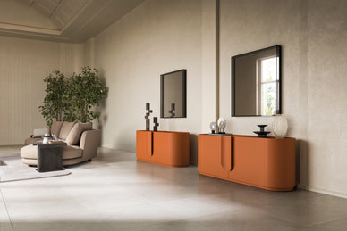 Circus er ikke bare opbevaring; det er en arkitektonisk erklæring i din stue. Stefano Spessotto har designet denne skænk med inspiration fra Le Corbusiers puristiske arkitektur. Designet leger med kontrasten mellem de rette linjer og de markante halvcirkelformede greb i lakeret metal, der bryder den ellers stringente flade.