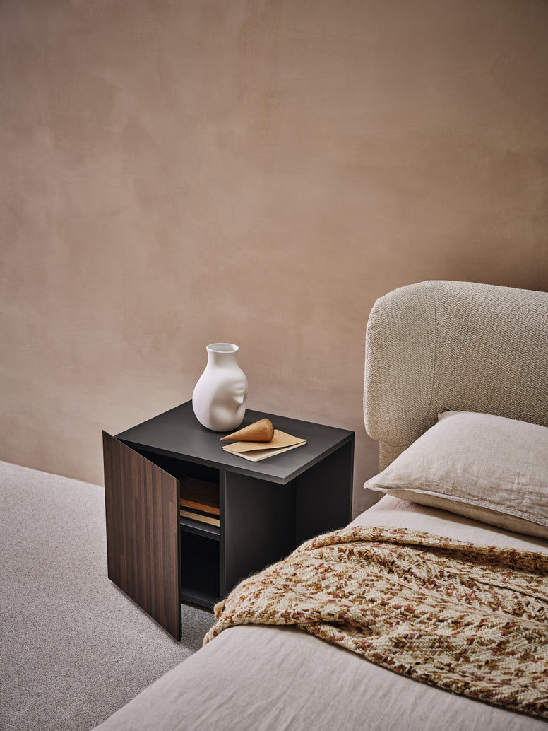 Denne udgave af Eric-sengebordet tilbyder en smule mere højde og et anderledes opbevaringsrum bag en elegant låge. Stefano Spessotto har skabt et møbel, der fungerer som en lille arkitektonisk boks ved siden af din seng. Den lukkede front giver et utrolig roligt udtryk og gemmer bøger og magasiner helt væk.