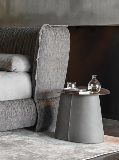Bordet udmærker sig ved sin unikke C-formede konstruktion. Den tynde, lakerede metalplade fungerer som en svævende hylde til din lampe og bog, mens den polstrede base tilfører varme og tekstur. Du kan vælge basen i læder for et eksklusivt, saddelmager-inspireret look eller i stof for en blødere fremtoning. Puppet er natbordet til dig, der vil have et møbel, der tør skille sig ud fra mængden og fungere som en selvstændig designgenstand.