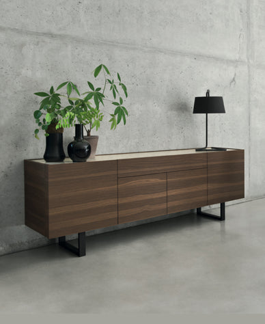 Horizon er en serie af stilfulde skænke og TV-møbler, som hviler på slanke metalben og udstråler en markant horisontal linjeføring. Skænkene fås i forskellige bredder og med forskellige konfigurationer af skabs- og skuffe-moduler, så man kan vælge den ideelle opdeling af opbevaringsplads. Et særligt kendetegn ved Horizon er det håndtagsløse design: låger og skuffer åbnes let via et smart greb langs den øvre kant, hjulpet af et løftet kantprofil der samtidig indrammer toppladen. Toppen kan vælges i hærdet glas eller keramik, hvilket tilfører møblet en luksuriøs accent og kontrast til de øvrige overflader. Helhedsindtrykket er elegant og moderne – en lang, lav skænk med et svævende udtryk, hvor intet forstyrrer de rene flader.