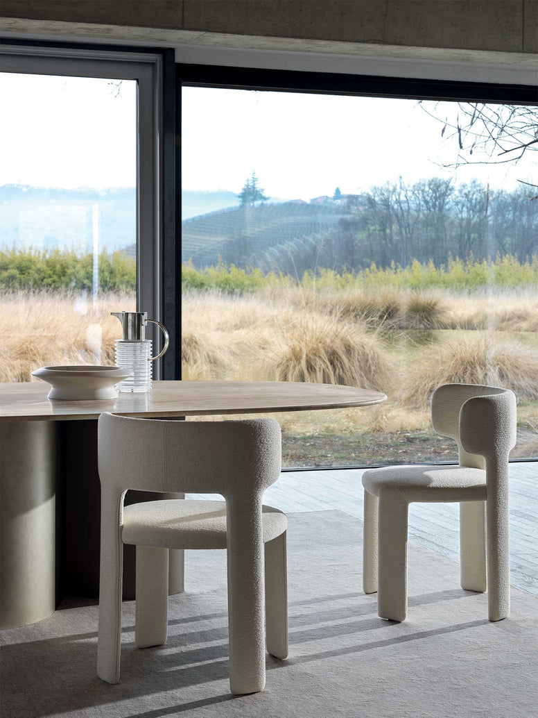 Lucy er designet af designduoen E-ggs med en klar vision: En stol skal ikke bare være et møbel, men en beklædningsgenstand til hjemmet. Denne tilgang har skabt en spisebordsstol, der er fuldt polstret fra top til tå, hvilket giver et sammenhængende og roligt visuelt udtryk uden synlige ben i andre materialer.
